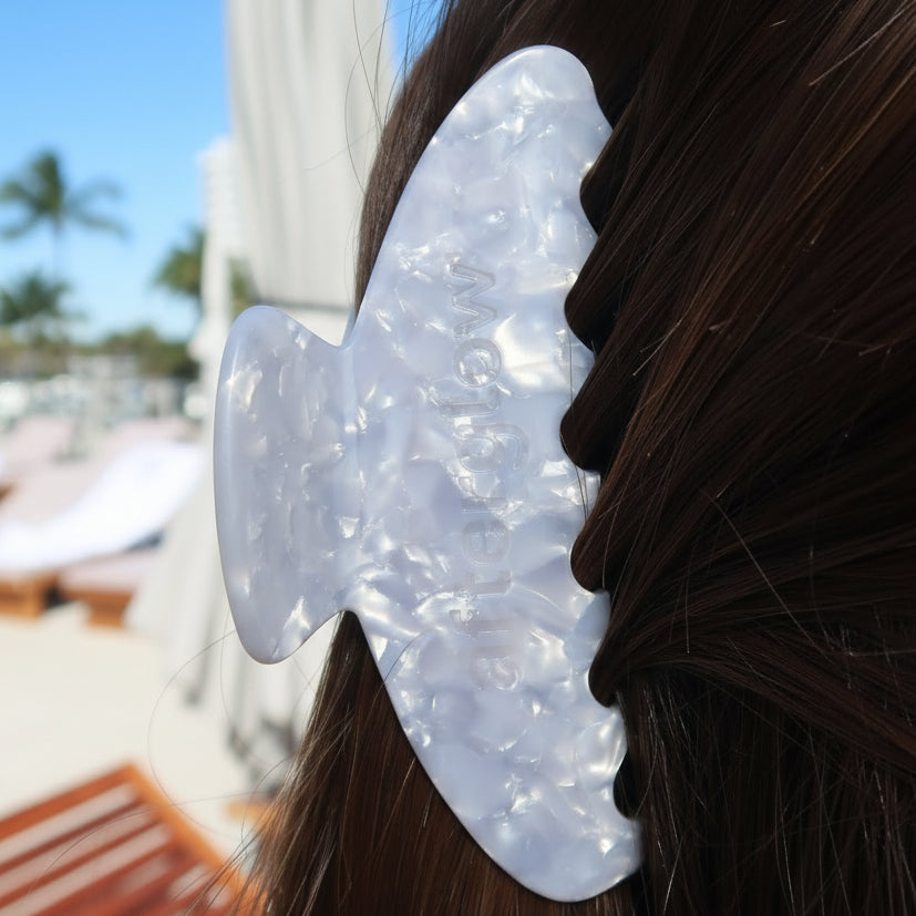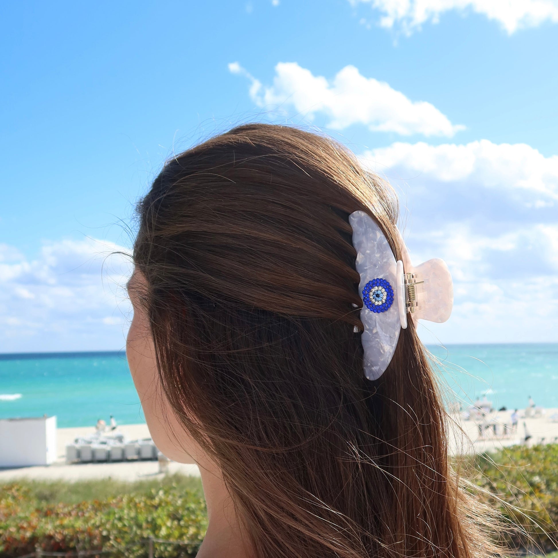 Custom acetate clip with rhinestone evil eye & engraving detail. Lightweight and essential for pre- & post-workout.